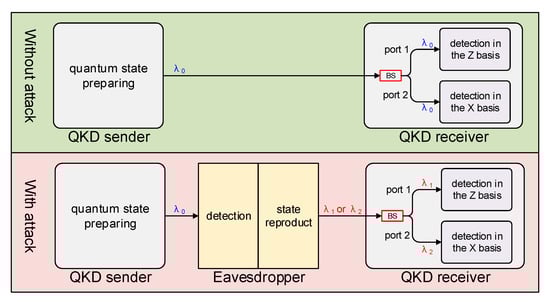 We first review the wavelength-dependent attack on optical beam splitters []. The schematic diagram of this attack is shown in Figure 1. Near the normal wavelength of the QKD system , the splitting ratio of the beam splitter is very close to 50:50, i.e., the splitting ratio , where and are the intensity of the different output ports of the beam splitter. However, if deviating far from the normal wavelength, the splitting ratio may change dramatically. Without loss of generality, we assume that . The extreme case is , where all incident light of wavelength exits from port 1 and all incident light of wavelength exits from port 2. Using this property, the following intercept-and-resend attack [] can be designed to steal the key of the QKD system: (1) intercept the quantum signal emitted by the QKD system and randomly select the measurement basis and record the measurement results; and (2) select the attack wavelength according to the measurement basis, prepare the polarization state according to the measurement result, and then resend the signal to the QKD receiver. For example, if an eavesdropper chooses the Z basis and the measurement result is 0, then the horizontal polarized attacking signal of wavelength is prepared and sent to the receiver. Due to the characteristics of the optical beam splitter, all the attacking signals go to port 1 for measurement in the Z basis, leading to a certain result of 0. In this way, the eavesdropper can control the QKD receiver to be the same as their measurement result. This kind of attack is known as the wavelength-dependent attack on optical beam splitter [].