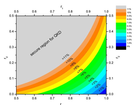 Near the wavelength , , the attack will cause an error rate of , which is too high to generate secure keys. In the extreme case, , the introduced error rate , and the eavesdropper obtains the same information as the receiver. The attacker will get 100% of the key’s information. We numerically simulated the additional error rate with different beam splitting ratios and present the results in Figure 2 below. Different colors in Figure 2 indicate different error rate ranges. The gray region in the upper left corner indicates that the additional error rate introduced by the attack has exceeded 11%, which will cause the QKD system to fail to generate secure keys. Thus, the attack will fail as it is impossible to steal information about the final keys, which means that the QKD system is secure. The colored area indicates that the attack introduces an error rate of less than 11%. Adjacent color blocks between them indicate a 1% increase in the error rate range. For example, the yellow area indicates an error rate of 7–8% and the orange range indicates an error rate of 8–9%. The objective of the attacker is to steal the key’s information, so the error rate introduced by the attack needs to be reduced as much as possible to hide the traces of the attack and maximize the information obtained. If the introduced error rate caused is limited to be less than 1%, the splitting ratio should meet and .