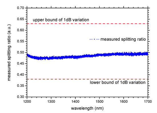The basic QKD system can be divided into a transmitter, which is responsible for quantum state preparation and encoding, and a receiver, which is responsible for quantum state decoding and measurement. QKD based on polarization encoding is widely used in quantum communication [,]. In the polarization-encoded QKD system, the transmitter can use multiple lasers to represent different polarization states [,], or use a single laser to encode different quantum states with an additional modulator [], while the receiver often uses passive decoding [,], where an optical beam splitter (BS) is used to split the quantum signal into two paths for measurements in two conjugate bases. Therefore, beam splitters are indispensable components in QKD. Bulky beam splitters made by fused biconical taper (FBT) or mirror-coating (MC) technology are commercial off-the-shelf products, and have been widely used in optical applications. Compact beam splitters can be achieved by integrated photonics. Both directional couplers [] and multimode interference (MMI) couplers [,] have been used to act as beam splitters on silicon quantum chips. Beam splitters of other structures have also attracted much attention, such as non-uniform adiabatic couplers [], photonic crystals [], metamaterials [], metasurface [,], polymers [,], and so on. The ideal BS in QKD should have a constant splitting ratio independent of external conditions. However, a realistic beam splitter is usually imperfect as the splitting ratio between the two ports is wavelength-dependent []. Adopting this imperfection, wavelength-dependent attacks on beam splitters were proposed [], which are able to steal some information about the key and threaten the security of the actual system.