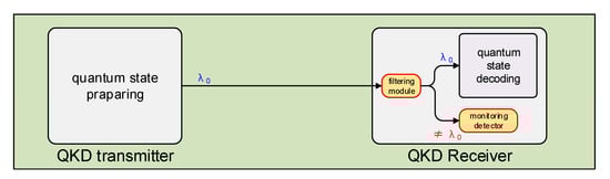 As previously analyzed, to perform a successful wavelength-dependent attack on the optical beam splitter, it is necessary to select two attack wavelengths that are far from the normal operating wavelength of the QKD system, where the splitting ratio deviates severely from 0.5. We propose a countermeasure by monitoring the light intensity of different wavelengths to protect the optical beam splitter from wavelength-dependent attack. The principle of this protection scheme is shown in Figure 5. A filtering module is added at the QKD receiver before the quantum state decoding. The light of operating wavelength is used for the quantum state decoding. The light of non-operating wavelength is separated and measured by a monitoring detector. If the monitoring detector receives a strong light, an alarm is triggered as there is likely a wavelength-dependent attack from the channel. The system should stop QKD and discard relevant data to prevent information leakage. Commonly used fiber optic system filters are available for Wavelength Division Multiplexer (WDM) or Dense Wavelength Division Multiplexer (DWDM), the combination of which can effectively improve the filtering bandwidth and isolation of the filter. Filters also increase the isolation of the system in the non-operating wavelength region, making it necessary for an eavesdropper to increase the light intensity to conduct the attack, thus also increasing the probability of detecting the attack and reducing the sensitivity requirements for monitoring detectors.