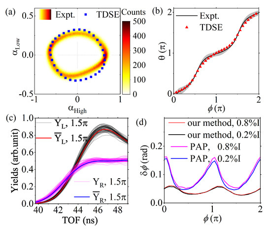 In Figure 3b, we depict the CEP () dependence of the polar angle (), which was extracted from the measured PAP. Apparently, this relationship is a complex combination of an oscillation and a linearly rising trend, instead of a simple line. As expected, the curve extracted from the experimental data can be well reproduced by the TDSE calculations. The grey shaded area indicates the uncertainties of the measured CEP by the standard CEPM procedure.