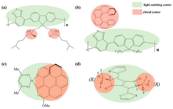 As shown in Figure 1a,b, the chiral part (side chain) and the light-emitting part (polymer backbone) are separated in the first and second strategy, which leads to lower performance or low gEL factor. In the third strategy, as shown in Figure 1c, small molecules integrate both the light-emitting center and the chiral center in the same functional group, overcoming the issue between efficiency and gEL factor [31]. However, the number of chiral light-emitting conjugation materials is still limited.