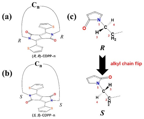 Our strategy is achieved by the combination of alkyl chain and diketopyrrolopyrrole plane: an achiral alkyl chain is employed to connect the two nitrogen atoms in diketopyrrolopyrrole (DPP) unit, and a closed-loop structure (CDPP) is formed, as demonstrated in Figure 2. Both the side chain and the conjugated backbone are achiral, the chiral center is formed after they are connected. The chiral centers are the two carbon atoms at the ends of the alkyl chain. Four groups/atoms being connected to the chiral center were sorted according to the Cahn–Ingold–Prelog priority rule [35]. One hydrogen atom (marked 3 in Figure 1d) forms a hydrogen bond with the oxygen atom in DPP, which has higher priority than the hydrogen atom marked 4. Therefore, the absolute configuration of these two chiral centers is discriminated. Additionally, the chirality of CDPP can be reversed by flipping the alkyl chain from one side of the DPP plane to the other side. It should be noted that to keep the molecule in a certain chirality, the alkyl chain should not be flipped. Once the alkyl chain is too long, it can be flipped at room temperature and the chirality of a molecule becomes uncertain. Therefore, overall achirality is anticipated.