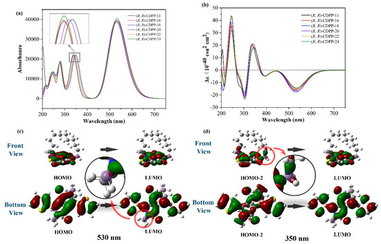 (a) calculated absorption spectra of (R, R)-CDPP molecules; (b) calculated ECD spectra of (R, R)-CDPP molecules; (c) the contour surfaces of frontier molecular orbitals (FMOs) involved in the absorption peak of (R, R)-CDPP-11 at 530 nm; and (d) the contour surfaces of FMOs involved in the absorption peak of (R, R)-CDPP-11 at 350 nm. The chiral centers are highlighted with light purple.