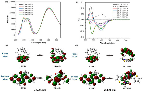 (a) calculated emission spectra of (R, R)-CDPP molecules; (b) calculated glum (after Gaussian broadening) of (R, R)-CDPP molecules and (S, S)-CDPP-11; (c) the contour surfaces of FMOs involved in the emission of (R, R)-CDPP-11, corresponding to the glum peak at around 392 nm; and (d) the contour surfaces of FMOs involved in the emission peak of (R, R)-CDPP-11, corresponding to the glum peak at 265 nm.