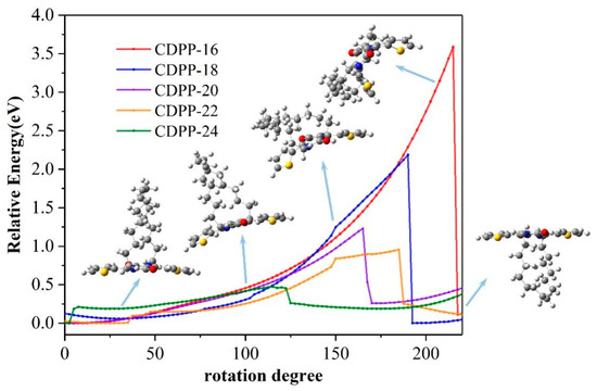In these molecules, the alkyl chain should maintain on a certain side of the DPP plane to keep the molecule in a certain chirality. We here investigated the chirality transformation when the alkyl chain flips. The relative energy and geometry changing from (R, R) state to (S, S) state were recorded. For CDPP-11, the alkyl chain is too short to flip. For others, at the beginning of flipping, total energies increased slowly with rotation as no significant deformation happened. When the alkyl chain approached the DPP conjugate plane and forces the plane to bend, total energies rapidly increased. The DPP plane recovered, and the molecular energy dropped to its lowest point after the alkyl chain successfully flipped to the other side. CDPP-16 has the highest energy barrier of 3.59 eV due to the shortest alkyl chain length. With increasing length, the energy barrier will decrease to 2.10, 1.23, 0.96 and 0.48 eV for CDPP-18, CDPP-20, CDPP-22 and CDPP-24, respectively. Details of the flipping process are shown in Figure 5 and Figure S9.
