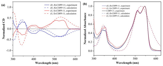 (a) Comparison between the experimental CD and calculated ECD spectra of CDPP-11; and (b) comparison between the experimental and calculated normalized absorption spectra of CDPP-11.