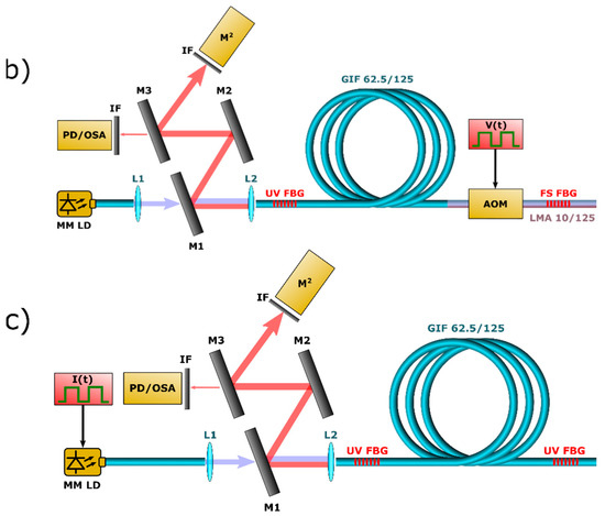 - Zlobina, E.A.; Kablukov, S.I.; Wolf, A.A.; Nemov, I.N.; Dostovalov, A.V.; Tyrtyshnyy, V.A.; Myasnikov, D.V.; Babin, S.A. Generating high-quality beam in a multimode LD-pumped all-fiber Raman laser. Opt. Express 2017, 25, 12581–12587. [Google Scholar] [CrossRef]