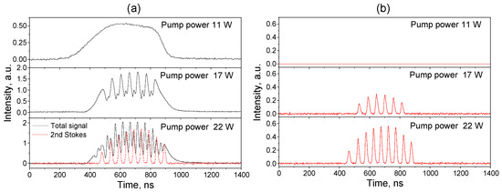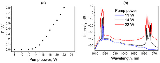 - Kuznetsov, A.G.; Nemov, I.N.; Wolf, A.A.; Kablukov, S.I.; Babin, S.A. Pulsed generation of multimode diode-pumped graded-index fiber Raman laser. In High-Power Lasers and Applications X; Li, R., Singh, U.N., Jiang, S., Eds.; SPIE: Bellingham, WA, USA, 2019; Volume 11181, p. 19. [Google Scholar]