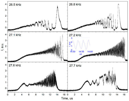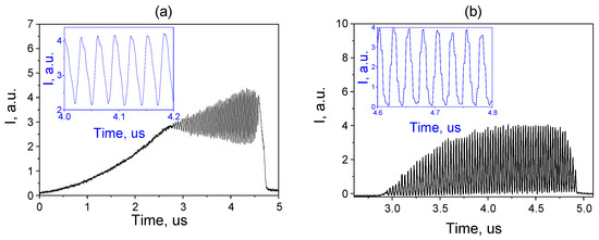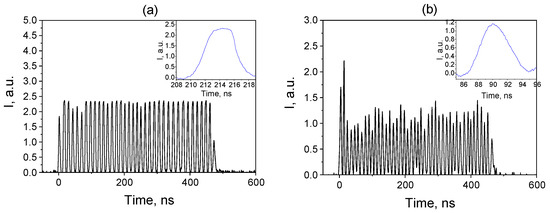 - Ivanenko, A.V.; Nyushkov, B.N.; Smirnov, S.V. Generation of high-energy single pulses and pulse clusters in ytterbium fibre lasers with quasi-synchronous modulation of the pump power. Quantum Electron. 2021, 51, 1061–1067. [Google Scholar] [CrossRef]