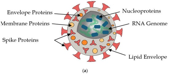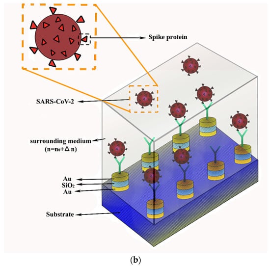 (a) SARS-CoV-2 structure; (b) structure of the proposed SARS-CoV-2 biosensor based on metal–insulator–metal nanoparticles.