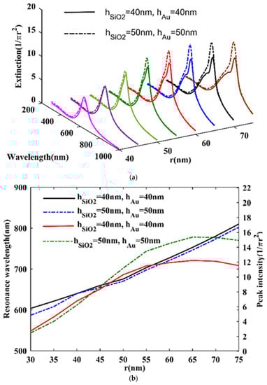 Extinction, resonance wavelength, and peak intensity of MIM nanocylinders: (a) 40 nm/40 nm/40 nm and (b) 50 nm/50 nm/50 nm Au/SiO2/Au thicknesses.