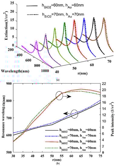 Extinction, resonance wavelength and peak intensity of MIM nanocylinders: (a) 60 nm/60 nm/60 nm and (b) 70 nm/70 nm/70 nm Au/SiO2/Au thicknesses.
