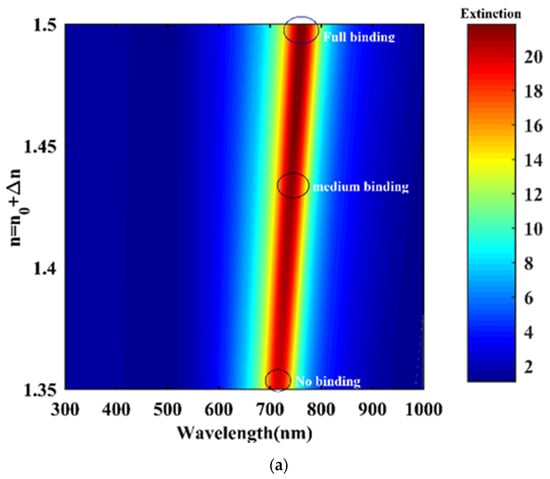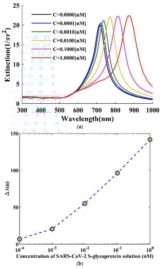 Here, refractive index changes of SARS-CoV-2 S-glycoprotein solution in different concentrations were used to analyze the performance of the designed biosensor. A change in the concentrations of the SARS-CoV-2 S-glycoprotein solution can be considered a change in the refractive index. Using these refractive index changes and applying them to our biosensor, the extinction was calculated as shown in Figure 8a for different concentrations of the SARS-CoV-2 S-glycoprotein solution. Furthermore, the wavelength shift as a function of concentration was calculated, as shown in Figure 8b. As can be seen, our designed sensor had relatively higher wavelength shifts, which helped us to detect different concentrations of SARS-CoV-2.