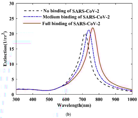 Our proposed SARS-CoV-2 biosensor monitors the extinction peak shifts induced by changes in the refractive index of the surrounding environment of the nano-discs. The absorption and scattering of light by a nanoparticle can be characterized by its electrostatic polarizability. For instance, for spherical nanoparticles, the electrostatic polarizability can be written as Equation (2).