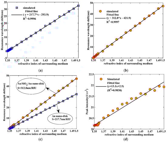 The amount of the resonance wavelength shift is proportional to the number of SARS-CoV-2 viruses present in the surrounding medium, which was modeled by the refractive index change in this work. Figure 7a,b show the wavelength shift as a function of surrounding refractive indices for a biosensor based on Au nano-discs and Au/SiO2/Au nano-discs, respectively. As seen in these figures, the resonance wavelength shift had an approximately linear relationship with the refractive index change of the surrounding medium. The progressive equation for linear fitting could be written as y = 217.7x − 293.9 for the Au nano-disc and y = 312.8x − 421.9 for the Au/SiO2/Au nano-disc, where y is the amount of wavelength shift, and x is the refractive index of the analyte. Considering the entire range of refractive index, the R-squared value was calculated as 0.9997, which shows that the designed sensor was relatively linear. The existence of some nonlinearity at some points was due to the existence of error, as the nature of the plasmonic concept does not have an entirely linear relationship with refractive index changes [,,]. The peak wavelength shifted by approximately 32.4 nm and 47 nm for the Au and Au/SiO2/Au nano-discs, respectively, when the surrounding medium refractive index changed from 1.35 (no binding) to 1.5 (full binding). Figure 7c compares the wavelength shift as a function of surrounding refractive indices for a biosensor based on Au and Au/SiO2/Au nano-discs. The main sensitivity was the slope of the fitted line according to Equation (4). According to this figure, sensitivities of 217.7 nm/RIU and 312.8 nm/RIU were obtained for the biosensor based on Au and MIM (Au/SiO2/Au) nano-discs, respectively. Thus, a small change in the surrounding medium refractive index resulted in a significant shift in the resonance wavelength.