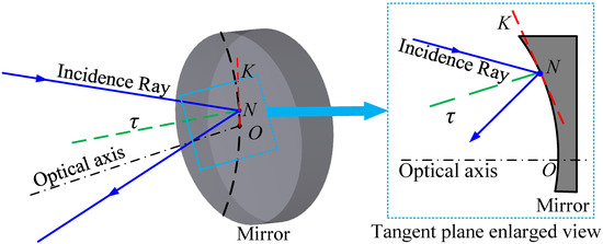 The schematic diagram of ray propagation at the intersection of the optical element is shown in Figure 1. The intersection of the incidence ray and the mirror is N. The tangent line to the mirror is made at point N. The slope of the tangent line is defined as K.