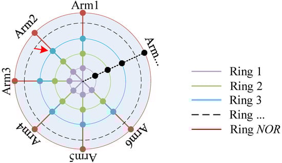 The sampling method of “Ring-Arm” is used, and NOR × NOA sampling points are selected. The number of selected Rings is NOR, and the number of selected Arms is NOA. The Rings and Arms are chosen as follows—Ring is defined as follows: Ring # represents the serial number of the Ring, from the center outward as light purple Ring 1, green Ring 2, blue Ring 3, black Ring... representing the possible Rings, dark red Ring NOR. The Arms are defined as follows: Arm # represents the serial number of the Arm, starting from the meridian +90° direction as Arm 1, and sorted counterclockwise as Arm 2, Arm 3, Arm... representing the possible Arms, Arm NOA. For example, Ring 3, Arm2 corresponds to the location of the reference point as shown by the red arrow in Figure 2.