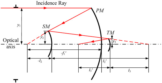 Assuming that the focal length of the three mirror system is f’, the expressions of the curvature radii of PM, SM, and TM and their corresponding thicknesses are calculated according to the paraxial optical theory as follows: