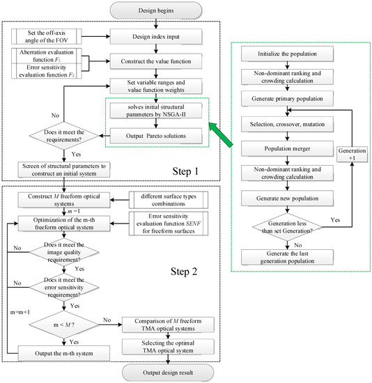 In this paper, a combined design method for freeform TMA optical systems is proposed. The NSGA-II algorithm is applied to obtain an initial conic system acceptable to both image quality and error sensitivity. Compared with the traditional “initial structure + DLS algorithm” method, this method obtains a globally optimal solution instead of an optimal local solution, providing an optimal initial structure for further optimization. A good conic optical system as the initial structure of the freeform optical system can be easily optimized to obtain good design results, thus significantly improving the design efficiency. The performance of the system is then continued to be improved by introducing freeform surfaces. The entire design process combines the advantages of the global optimization method, the parameter control method, and the freeform surface optimization method, in which the global optimization method is more suitable for the search of the initial structure and in the subsequent freeform surface optimization process, and the global optimization method with large sample iterations is not suitable because of the complexity of the freeform surface representation. Therefore, we use the parameter control method to optimize the freeform optical system in the subsequent optimization process. Throughout the design process, we apply different desensitization methods in different steps according to their characteristics, which not only reduces computation time but also obtains good design results. From the design results, the method proposed in this paper is effective.