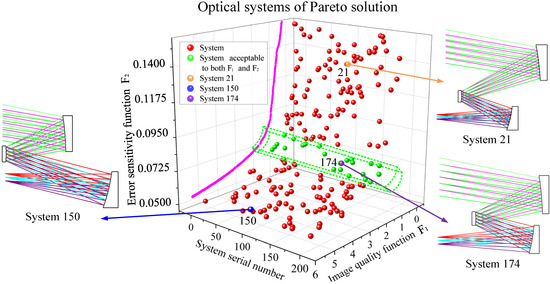 The NSGA-II algorithm is used to solve, and the Pareto results are shown in Figure 5, where each ball represents a set of solutions. The projection of all systems on the corresponding surface of the F1-F2 plane is the Pareto front (magenta curve). Three representative systems are selected from 200 sets of results for display. System 21 (orange ball) is the system with better image quality and higher error sensitivity among all systems. On the contrary, System 150 (blue ball) is the system with lower error sensitivity and poorer image quality. In Figure 5, the green dashed box is considered to be systems acceptable to both image quality and error sensitivity. System 174 (purple ball) is a system randomly selected in this area. The image quality of system 174 is better than that of system 150, whereas its error sensitivity is lower than that of system 21. Therefore, system 174 is selected as the initial structure of the freeform TMA optical system. The initial structure parameters of System 21, System 150, and System 174 are shown in Table 1.