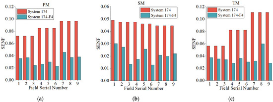 Error sensitivity analysis of three mirrors of System 174 and System 174-F4: (a) SENF of PM; (b) SENF of SM; (c) SENF of TM.
