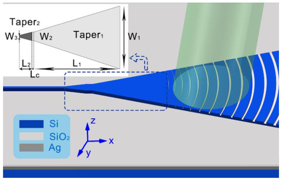 Then, we design and simulate the 3D structure of the apodized grating couplers for the silicon HPWs. The entire structure is schematically illustrated in Figure 2, and it includes a focusing grating coupler, a mode converter consisting of a two-stage-taper and the silicon HPW that light is finally coupled into. The structural parameters of the gratings themselves are set according to the optimal parameters obtained from the 2D simulations. Focusing gratings are used here to compress the transmission region from the wide gratings to the narrow waveguide, which not only results in a more compact device but, what’s more, reduces the propagation loss by decreasing the length of the overall plasmonic waveguide region. To fully exploit the strong confinement of the silicon HPWs, the waveguide width can be as small as 100 nm. This imposes challenges on converting the light, which distributes in a 10 µm scale in the gratings to such a small waveguide since higher-order modes can be easily inspired and then leak or interfere with the fundamental mode in the tapered waveguide. To avoid this, we introduce a two-stage-taper (in the dashed line frame in Figure 2) to accomplish the adiabatic mode converting.