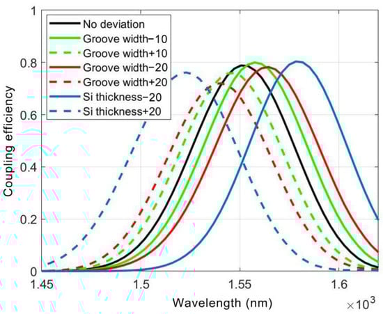 It is well known that the performances of a grating coupler for the silicon dielectric waveguide can be degraded by the fabrication deviations from the optimal designs. Here, we take the silicon HPWs with a bottom metal layer as an example and analyze how the fabrication deviations affect the coupling efficiencies of the proposed apodized grating couplers for these HPWs, as shown in Figure 8. The black solid line, which is extracted from Figure 3d, indicates the CEs for couplers with the optimal dimensions. Green curves and red curves show the simulated CEs of the couplers with ±10 nm and ±20 nm deviations from the originally designed groove widths, respectively. Degradations inevitably happen but are smaller than 12% even at the ±20 nm deviations. Considering the modern nano-fabrication technologies are capable of controlling the deviations to ±10 nm, the degradations of the CEs at 1550 nm can be as small as <4%, thanks to the large bandwidths of the proposed grating couplers.