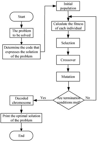 The genetic algorithm is a method with high efficiency, parallel processing, and strong global search capability [37]. It can automatically acquire and accumulate knowledge about a search space during the search process and adaptively control the search process to obtain the optimal solution [38,39]. In a genetic algorithm, the initial solution to the required problem is usually generated by a random process. The solution to the problem is encoded into the chromosome using a specific coding method [40], thereby forming population individuals. Then, an appropriate function is used to calculate the fitness of each individual, the adaptability of the individual to the environment is evaluated by its fitness, and the process of survival of the fittest is performed. Individuals with low fitness are eliminated, while those with high fitness are selected for genetic operations of selection, crossover, and variation. For the population after the genetic operations, the law of survival of the fittest is also used to select the most adaptable individual set to form the next generation of the new population. Then, the sub-population undergoes similar repeat genetic operations until a certain termination condition is reached.