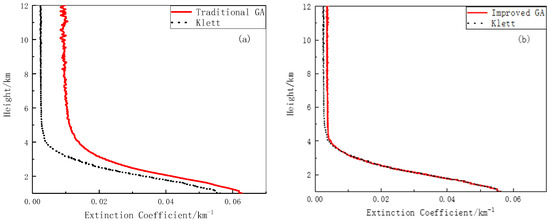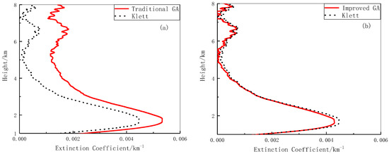 Figure 5b shows the inversion results obtained using the improved genetic algorithm and the Klett method. It can be seen that the inversion results obtained by the two methods are very close in terms of both trend and value below 4 km. Although there is a slight difference between the values above 4 km, the trend is consistent. Compared to the results shown in Figure 5a, the improved genetic algorithm produces a better inversion effect.