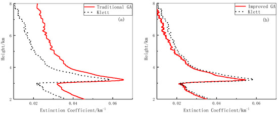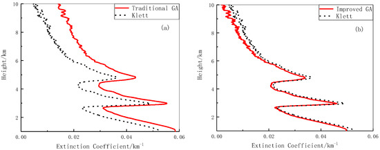 Figure 7 shows the inversion results obtained on a day with more obvious cloud features. Figure 7a shows the inversion results obtained using the simple genetic algorithm and the Klett method. As can be seen, there is obvious variation in the air mass between the heights of 3 and 6 km, producing distinct characteristics in the signal. Despite the large difference in values between the two inversion methods, the trends of the profiles are similar. Figure 7b shows the inversion results obtained using the improved genetic algorithm and the Klett method. Compared with Figure 7a, the inversion results obtained using the improved genetic algorithm are proven more accurate and reliable.