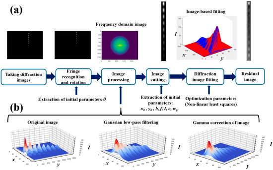 The detailed descriptions diagram of the method: (a) the procedure for fitting diffraction images; (b) diffraction images with filtering and gamma correction.
