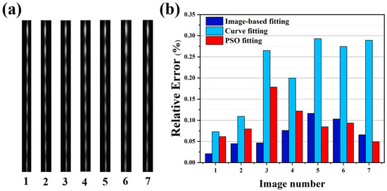 To be able to compare the results of different methods for the same filament diameter, a 125.2 m diameter filament is selected for the experiment. Figure 4a shows diffraction images of a filament with a diameter of 125.2 m. The absolute errors of measurement for the different methods are shown in Figure 4b. According to the results, the method of image-based fitting has better stability in the calculation. Its accuracy is superior to the fringe fitting of the fringes. The PSO fitting method requires adjustment of the particle parameters and long convergence times (Each calculation takes approximately half an hour), which results in more unstable PSO fitting results compared to image-based fitting. In addition, each initial parameter can be calculated mathematically without artificial input in the calculation. This allows the parameter optimization process to converge quickly, with each calculation taking less than one minute.