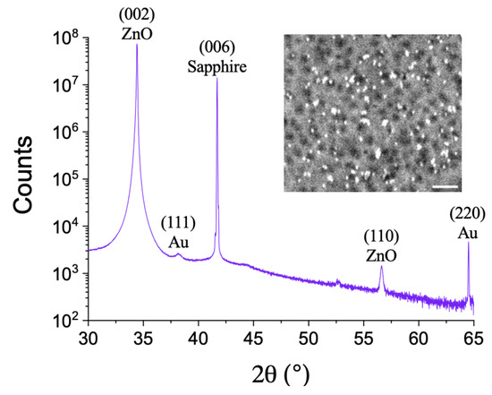 X-ray diffraction pattern obtained for the ZnO film with AuNPs on sapphire substrate (see SEM image in the inset, and white bar = 300 nm).