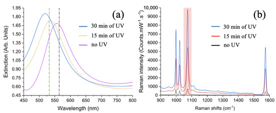 Next, we recorded extinction spectra of Au nanoparticles on ZnO film without UV-irradiation and with UV-irradiation times of 15 min and 30 min in order to determine the position of their plasmon resonance (see Figure 2a). We observed a blueshift of 20 nm and 36 nm for the plasmonic resonance of Au nanoparticles when the samples were irradiated with UV during 15 min and 30 min, respectively. This blueshift in the plasmonic resonance upon UV-irradiation is explained by an increase in electron density due to a charge transfer mechanism induced by light from ZnO film to gold nanoparticles. This increase in electron density can be evaluated as follows [45,46,52]: