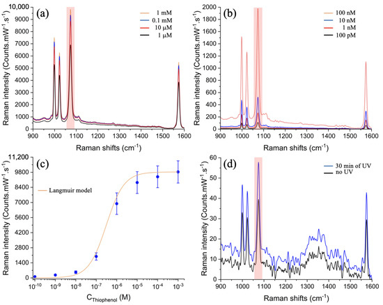 From Figure 3c, we obtained a limit of detection (LOD) of 100 pM for thiophenol molecules. This LOD is more sensitive than that achieved with Klarite SERS substrates composed of gold inverted pyramids (LOD = 10 M, see reference [57]). Furthermore, the experimental data of the Figure 3c were fitted with a Langmuir model defined as follows [57,58]: