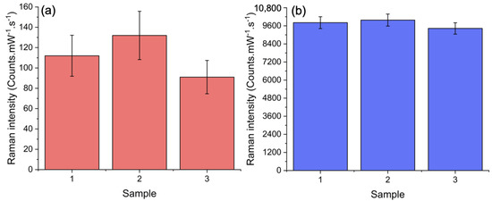 where (100 pM) corresponds to the thiophenol concentration for SERS+PIERS experiment, and (1 M) is the thiophenol concentration used for the experiment of reference. (see the black SERS+PIERS spectrum in Figure 3b) is the SERS + PIERS intensity, and (see the blue Raman spectrum in Figure 3d) is the Raman intensity. Figure 3d corresponds to the Raman spectra of the ZnO film without AuNPs (reference experiment). We obtained an AEF value of 1.9 × 10. To conclude this work, we studied the uniformity of the Raman (SERS + PIERS) signal for our plasmonic substrates. To do that, Raman intensities of the vibration mode at 1073 cm were acquired on 10 positions taken distinctly on the substrate with same excitation conditions for assessing the relative standard deviation (RSD) (see error bars of the Figure 3c). We achieved a nice uniformity the average RSD of which was <20% for all the experimental points of the Figure 3c. To complete that, the reproducibility of samples was also investigated by registering the Raman intensity of the same vibration mode (1073 cm) on three samples. Figure 4a,b display the Raman intensity from these samples (for UV-irradiation of 30 min) for the thiophenol concentrations of 100 pM and 1 mM whose the average RSD is <20%, respectively. Thus, we registered a nice uniformity and reproducibility of the Raman signal for these plasmonic substrates whose the average RSD was <20%.