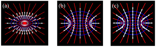 To clarify the distinction between the ESRP and two other elliptic-symmetry vector beams reported earlier [7,8], we compare their polarization structures and mathematical descriptions herein. As depicted in Figure 1, the polarization structures are plotted along with their respective coordinates: the vector beams demonstrated in [7,8] are presented in Figure 1a,b, whereas the ESRP beam proposed in this research is portrayed in Figure 1c.
