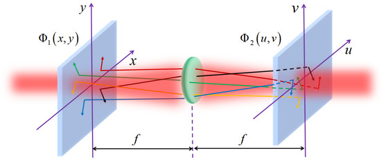 First, let us consider a general geometric coordinate transformation performed using a single lens, as displayed in Figure 3, where the input field at the front-focal-plane was set as and the output field at the back-focal-plane was . Based on the paraxial approximation supporting the Fourier transform between the two focal planes and the stationary phase principle (as the considered spatial scale is much larger than the wavelength), the point-to-point corresponding field map can be fulfilled with the application of two specific phase plates and (though an amplitude adjustment term is required owing to the conservation of light energy ) [12]. Herein, was determined by the requested coordinate transformation as