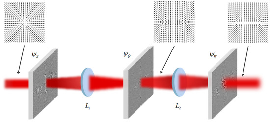Upon determining the transformation in Equations (14) and (15), the two phase plates should be derived based on Equations (4) and (5) to satisfy the transformation in Equation (14) (with the phase distribution defined as and ) as well as that for fulfilling the transformation of Equation (15) (with the phase distribution defined as and ). As the correction phase plate and the transforming phase plate is located at the same plane (at Q-plane), we can combine them into a single phase plate. More importantly, the finalized three phase plates (, , and ) should be arranged into the 4f optical system, as illustrated in Figure 5, which included the illustrated polarization patterns of the three light beams: incident beam before , light beam in the intermit plane after , and output beam after .