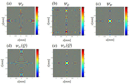 First, the phase distribution patterns of the three phase plates , , and , and the two phase functions and are exhibited in Figure 6, which were evaluated from Equations (16)–(20) by setting the following parameters: wavelength was , focus radius of the confocal ellipses was , focal lengths of lenses and were both (referring to Figure 5), and the phase plate size was .