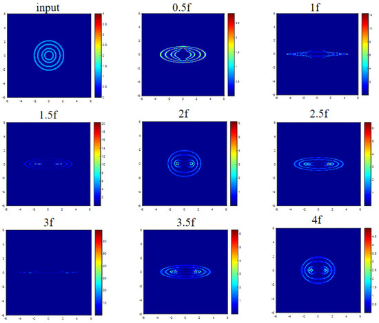 Thereafter, before working on the ESRP beam, we initially studied the property of the circle-Cassinian transformation of the 4f optical system illustrated in Figure 5 by simply setting the input beam as a linearly polarized beam (essentially the scalar case) with its amplitude pattern composed of several rings (with inner radii of 0.5, 0.9, 1.5, and 2 mm and a thickness of 0.2 mm), as illustrated in Figure 7. The major purpose of such a study is to verify the developed MATLAB program that was adapted from the program reported in [27]. This program could derive the light field distribution at any vertical plane by calculating the Fresnel diffraction integral based on the fast-Fourier transformation (FFT) algorithm. The intensity distributions at several representative planes are presented in Figure 7. As observed, after the first transformation according to Equation (14), the set of rings has transformed into a set of Cassinian ovals at the 2f plane, and the second transformation according to Equation (15) maintains the Cassinian oval patterns.