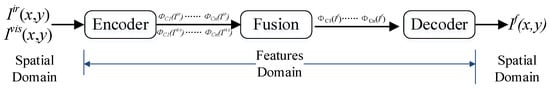 In certain scenarios, it is better to process the image in the transform domain and then use the inverse transform to return it to the spatial domain [25]. In this study, the images to be fused are transformed from the spatial domain to the feature domain for fusion, and then to the spatial domain. Figure 1 shows the domain transform framework for the IR and visible images fusion. First, the encoder in Densefuse net [19] is employed to extract the features of the IR and visible images; then, the feature maps’ weights are optimized, and the two sets of feature maps are fused. Finally, the decoder in the Densefuse net converts the fused feature maps to the spatial domain to obtain the fused image.