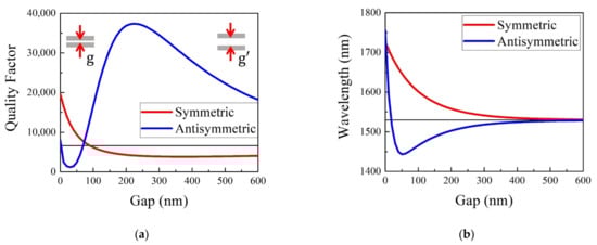 We investigated the optical properties of the symmetric and antisymmetric modes as a function of gap distance, g. The Q factor and the resonant wavelength changed based on the change in g because of changing the amount of interaction of the electric field in the radial direction inside the disk for each symmetric and antisymmetric mode (see Figure 2).