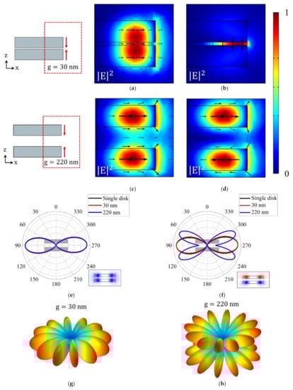 We investigated the electric field intensity profiles and vector plots in the cross-sectional view of the XZ plane and the radiation patterns in Figure 3 to understand the different gap dependences of the Q factor and the resonant wavelength of the symmetric/antisymmetric modes. Figure 3a,c show symmetric mode profiles with a gap distance of 30 nm and 220 nm. The vector plots of the electric fields excited in the two dielectric disks exhibited the same phase (see Figure 3a,c). Therefore, the symmetric mode of g = 30 nm and 220 nm shows similar radiation patterns as single TE-like WGM in the normalized far-field patterns of Figure 3e, having the strongest radiation at 90° and 270°, to the direction of the plane of the disk.