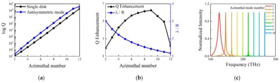 We analyzed the amount of enhancement in the Q factor compared to that of the single disk for different azimuthal numbers with a focus on increasing the Q factor by destructive interference with the same structural condition, as shown in Figure 4a.