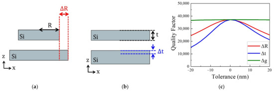 In order to take into account the fabrication suitability of the proposed cavity, we investigated Q factors as functions of the fabrication errors, radius, and thickness of one disk, in the tolerance range of ±20 nm for the antisymmetric mode in a double disk cavity with R = 850 nm, t = 220 nm, and g = 220 nm. We assumed the lower disk has a larger radius or thickness than the R and t of the upper disk with the amounts of or , as indicated in Figure 5a,b. means the change of the gap distance from g = 220 nm, which is already investigated in Figure. 2. When and are −20 nm, the Q factors drop to 24,500 and 15,200. The fabrication errors of R and t cause a decrease in the Q factor because the balance of the radiation field between two disks is broken, as shown in Figure 5c. On the other hand, does not significantly affect the Q factor in the range of 20 nm. Considering the fabrication process of the wafer growth and the thin film deposition, the gap distance and the thickness of the disks can be fabricated with high accuracy. Since e-beam lithography and dry etching will determine the radius and the accuracy can be worst in the R, t, and g, the controls of the radius of the upper and lower disks would be important in the performance of the proposed cavity.