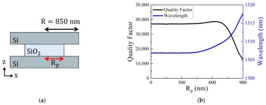 In order to have the possibility of manufacturing the proposed cavity with a disk radius less than 1 μm and a low index pillar, we investigated the Q factor dependence on the radius of the pillar in Figure 6. As shown in Figure 6a, the low index pillar has a radius of slightly smaller than the disk radius, R, and the refractive index of the pillar was set to 1.48, which is the value of SiO2 at telecommunication wavelength. For the antisymmetric mode with m = 6 in the cavity of R = 850 nm, t = 220 nm, and g = 220 nm, the Q factor, and the resonant wavelength are investigated when the pillar radius varies from 0 to 900 nm (Figure 6b). The Q factor and resonance wavelength are almost maintained in the region from 0 to 700 nm. = 0 nm indicates just an air gap between two disks. At > 700 nm, Q factor decreased dramatically. Considering the realization of the proposed cavity, if the radius of the low index pillar is smaller than 700 nm, the performance of the cavity such as the Q factor is maintained. Therefore, careful selective wet etching can control the pillar size in the fabrication of the cavity, as reported in the sub-micrometer pillar of the photonic crystal laser [] and the microdisk []. The tolerance of the pillar size of 700 nm would make the realization of the proposed cavity feasible. If the cavity is placed above the additional pillar on the substrate and the height is large enough to minimize the leakage radiational loss to the substrate, the radius of the pillar also affects the Q factor similarly.