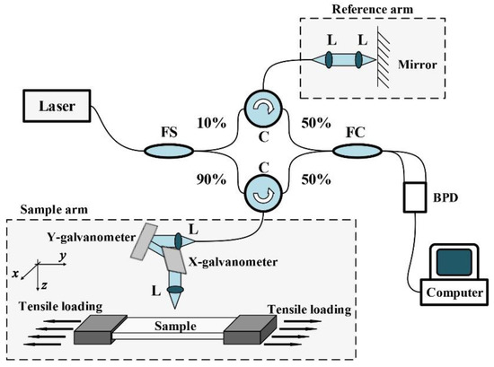 Figure 1 is a schematic illustration of an experimental setup of the DVC-OCE system. The OCE system consists of a loading device and a swept-source OCT system (SSOCT) [9]. The laser light emitted from the swept laser (HSL-20-100-B, Santec, Aichi, Japan) goes to a coupler, 90% of the laser light is focused on the sample surface. In total, 10% of the laser enters the reference arm. The two beams of light pass through the circulator and enter the 50/50 coupler to interfere and be collected by a balanced photodetector (EBR370006-02, Exalos, Schlieren, Switzerland). A single laser signal can reconstruct a one-dimensional image of the sample (A-Scan). The galvanometer controls the laser movement in the X direction to obtain a 2D image (B-Scan). On this basis, the galvanometer controls the laser movement in the Y direction to reconstruct a three-dimensional image (C-Scan). The OCE system can obtain three-dimensional images of deformation under different loadings.