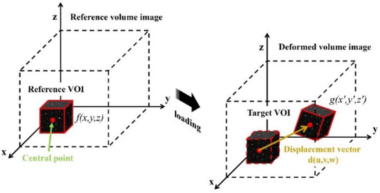 The basic principle of the standard sub-block-based DVC method is shown in Figure 3. The DVC method is mainly based on the correlation calculation between the reference volume of interest (VOI) and the target VOI, where the gray value is assumed not to change before and after deformation. Figure 3 shows the matching of a reference block f(x,y,z) and the block g(x’,y’,z’) after deformation for displacement calculation. This paper employs a coarse search step based on the full-search zero-mean normalized cross-correlation algorithm (ZNCC) correlation function and the inverse compositional Gauss–Newton (IC-GN) DVC algorithm developed in our lab previously [9]. The 3D displacements can be obtained with sub-voxel resolution through the coarse–fine search DVC calculation.